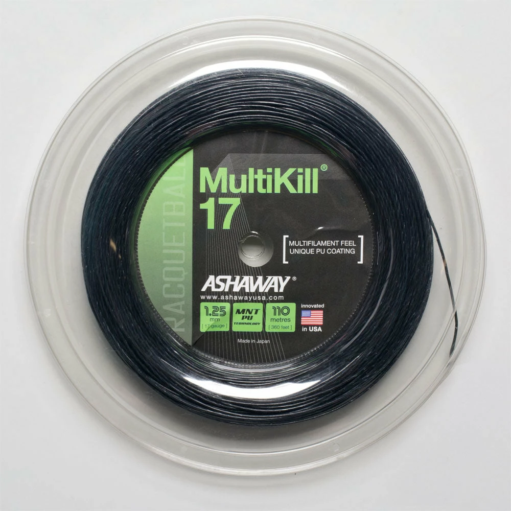 The Ashaway MultiKill® 17 Black 360′ Reel of racquetball string is designed to provide players with a truly tough, durable, and spin-friendly string. This multifilament string features a polyurethane resin and a unique matrix that helps give players an enhanced feel while maintaining strength.