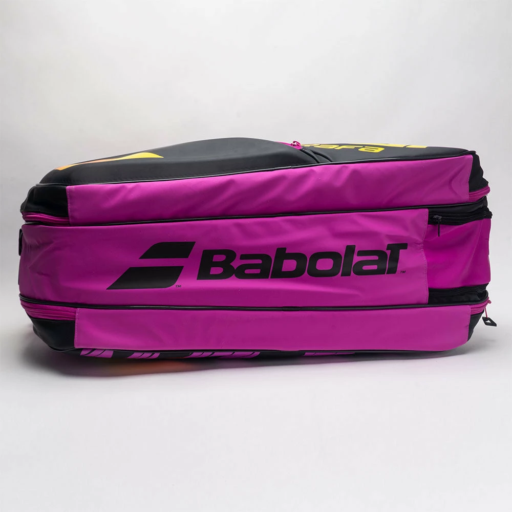 Spacious and practical, the Babolat Pure Aero Rafa 6 Racquet Bag makes an impression when you take the court. Find a home for six of your favorite racquets in the two main compartments. A transparent shoe compartment and side pockets organize the rest of your gear. For tennis players who demand the best from their equipment, the Babolat Pure Aero Rafa 6 Racquet Bag meets your needs!