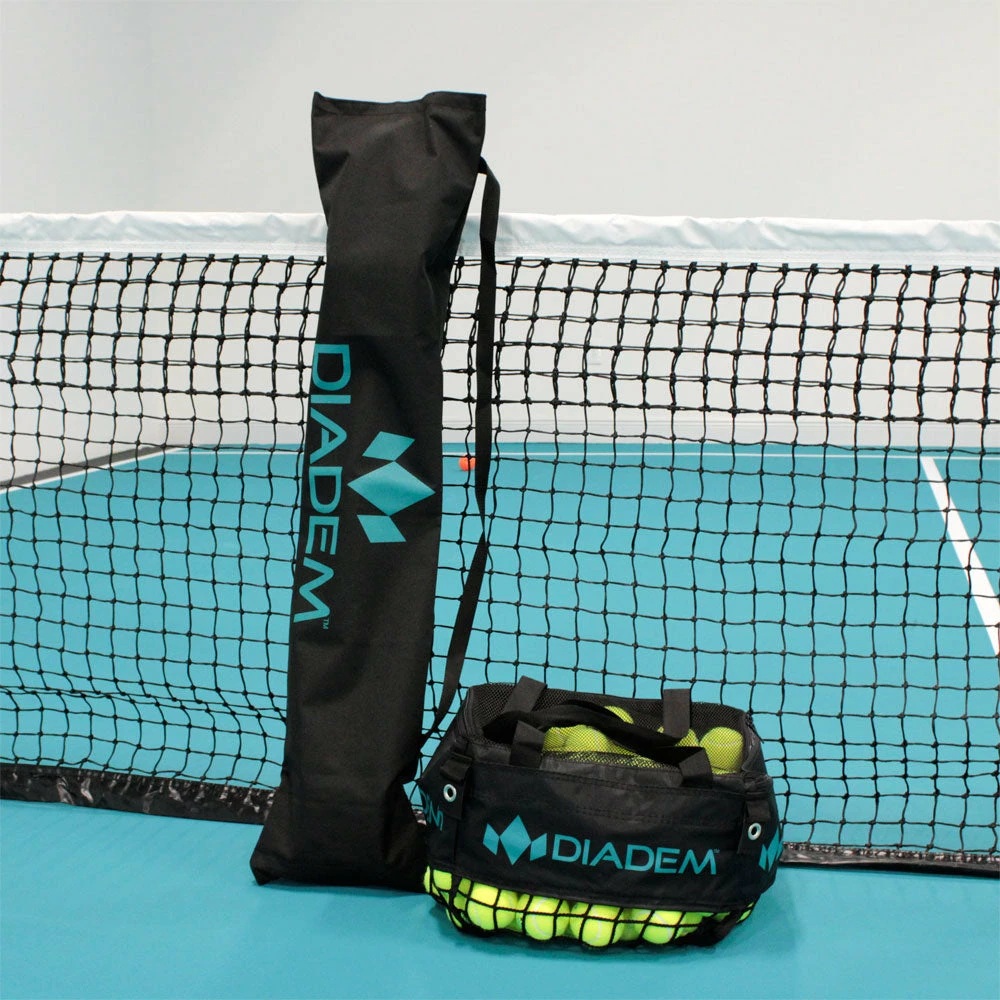 Introducing the next evolution in portable ball carts. The Diadem Ball Cart 150 Balls uses unique cross configuration legs and larger wheels to increase stability. The lightweight aluminum frame won’t rust in tough conditions, and netting on the lower portion bag allows airflow in windy environments. Easy lock rings clip on and allow you to take off the bag when you want, and locking wheels keep your cart in place when necessary. Stable, portable, and durable: The Diadem Ball Cart 150 balls takes your training to another level!