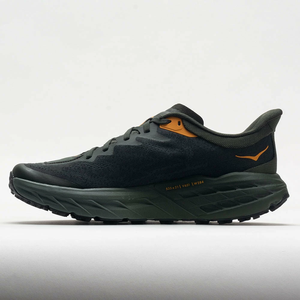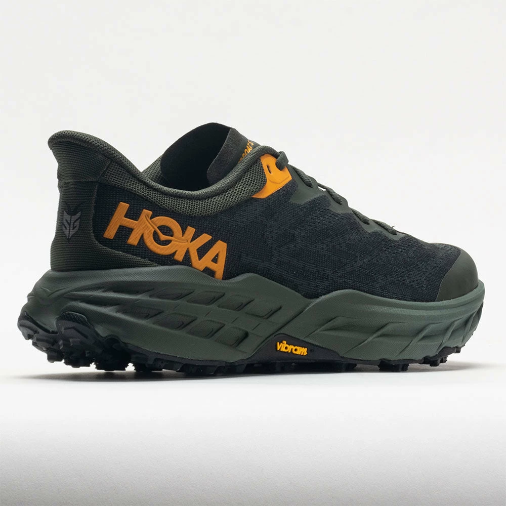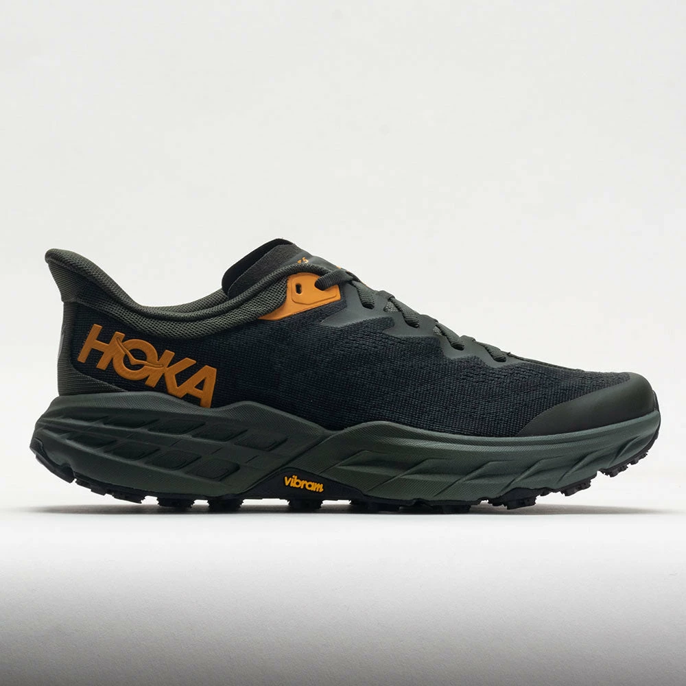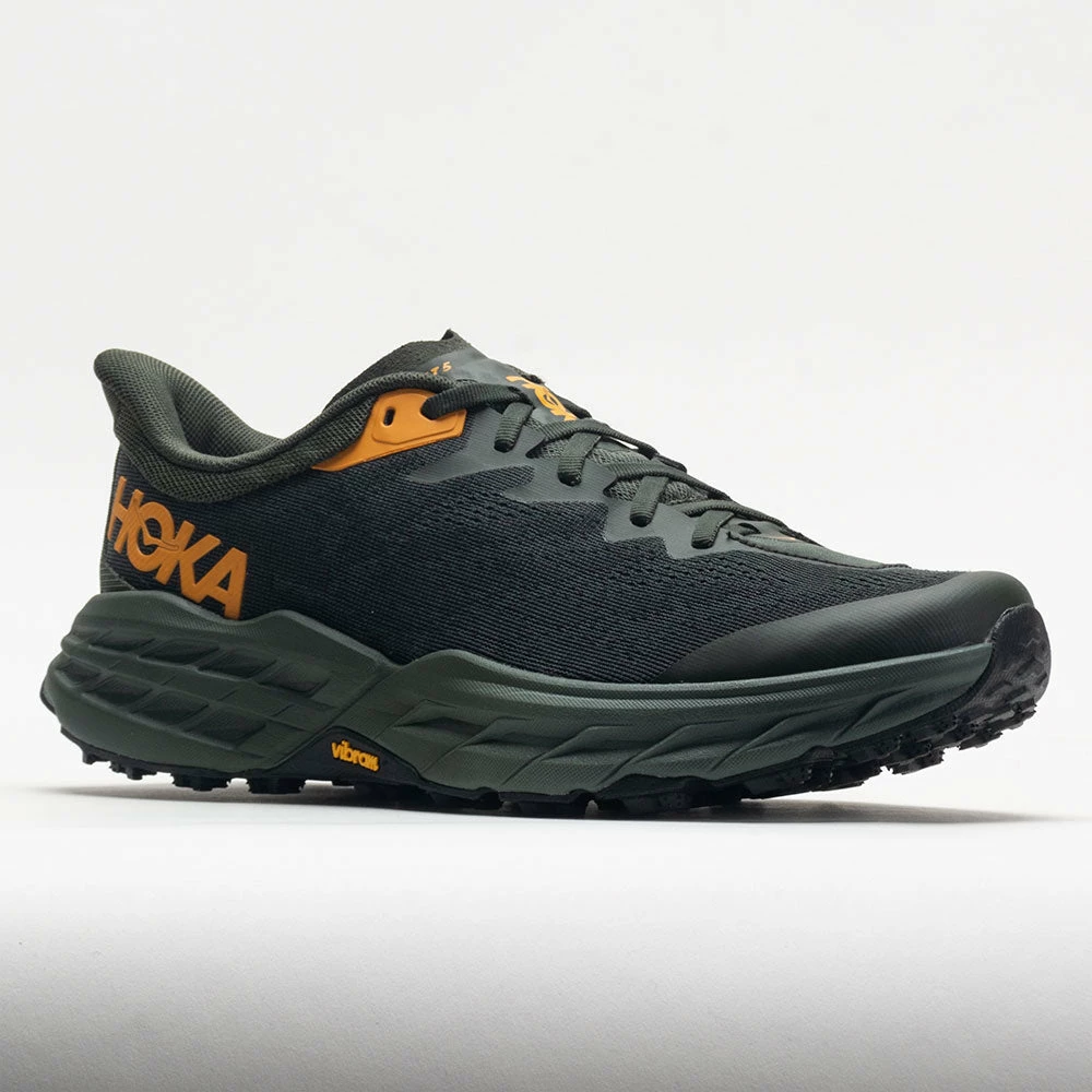 Grippy and cushioned, the HOKA Speedgoat 5 is one fast trailblazer! This trail-ready workhorse features the same stack height and rocker profile as its predecessor, now in a lighter and more durable design. Stay protected from trail hazards in the double jacquard mesh upper. The Vibram® Megagrip outsole supplies confident traction on any terrain. For runners and hikers who want to float over rocky roads, the HOKA Speedgoat 5 prevails on any trail!
