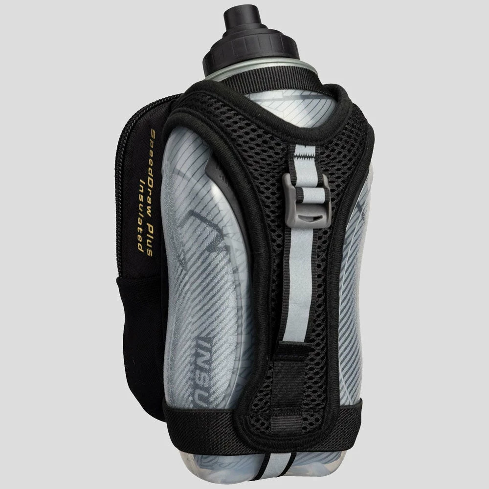 The Ergonomicalâ„¢ Nathan SpeedDraw Plus Insulated 18 oz Flask allows for the most natural grip possible and easy-squeeze access to hydration. The insulation makes this the first-ever double-wall flask and will help keep your liquids cooler for much longer. A fully adjustable hand strap with thumbhole enables grip-free running.