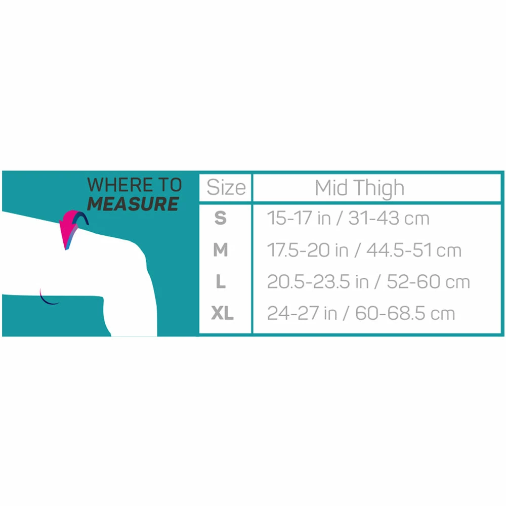 The OS 1st QS4 Thigh Support provides the graduated compression athletes need to combat nagging injuries and get back to training. The Compression Zone Technology® helps relieve pain associated with Iliotibial Band Syndrome, hamstring weakness, quad strains, and helps deal with leg fatigue, promoting quicker recovery. This latex free sleeve is sleek enough to wear under clothing and is perfect for packing away in a travel or gym bag.
