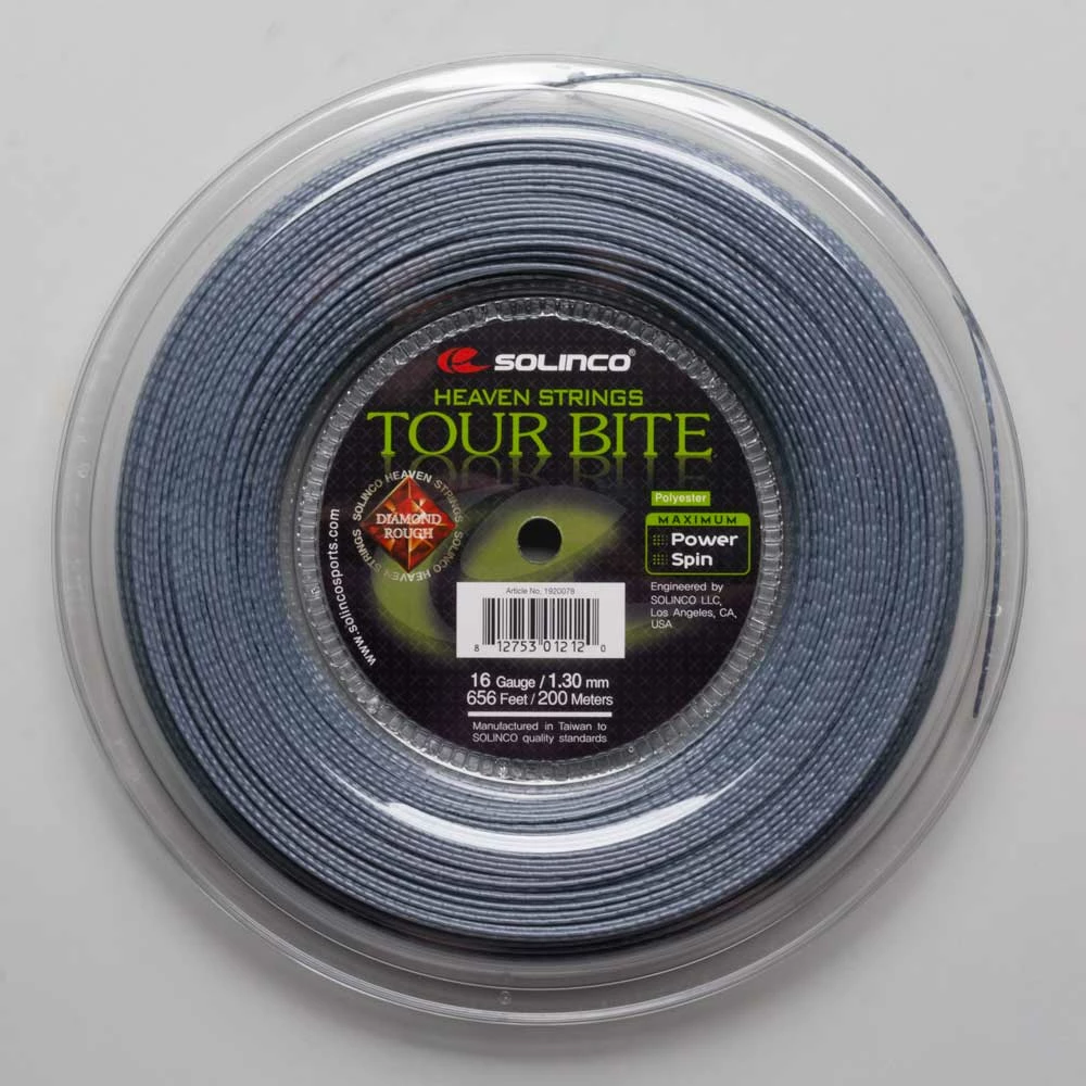 The Solinco Tour Bite Rough 16 1.30 656′ Reel of tennis string is a textured co-polyester that offers a powerful combination of spin and precision. Intermediate to advanced level players will love the performance of using this string.
