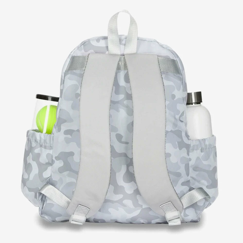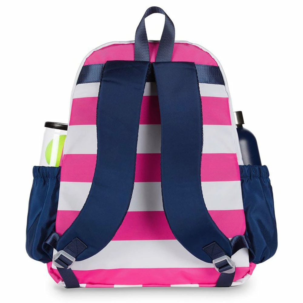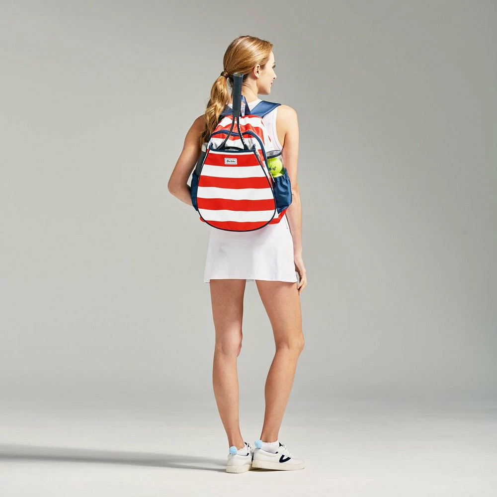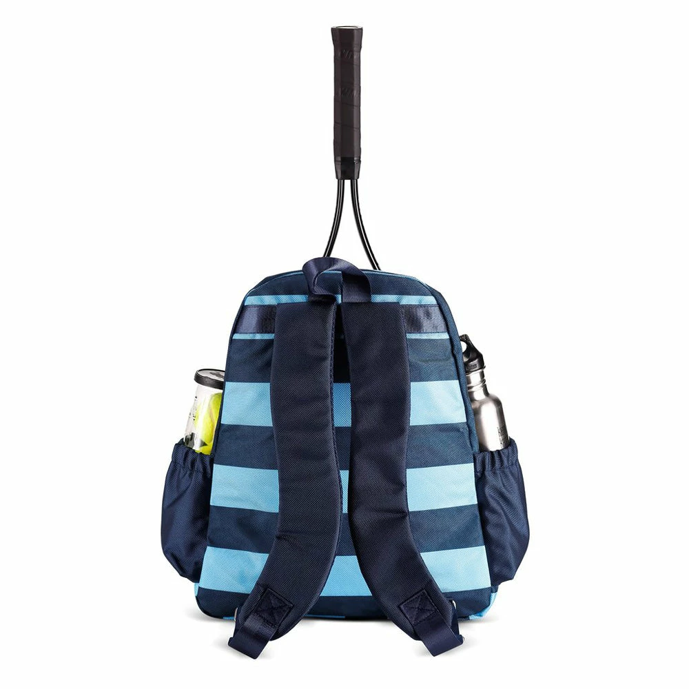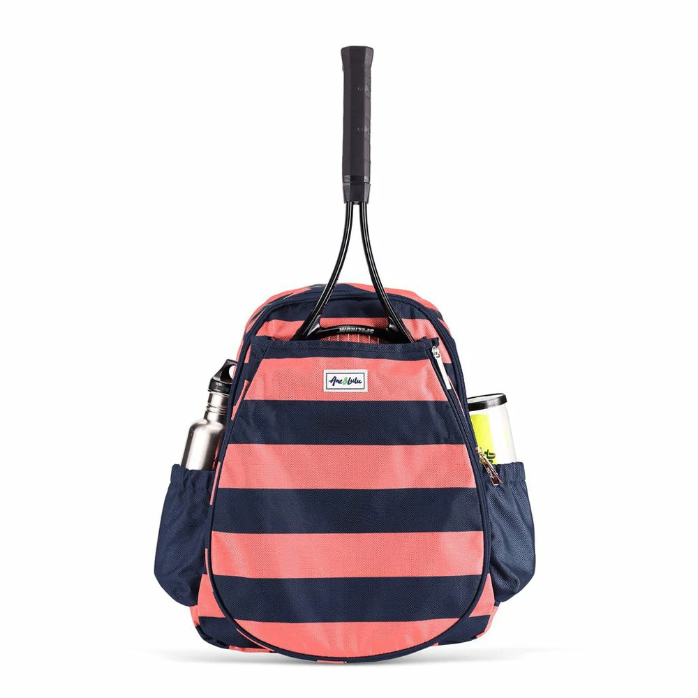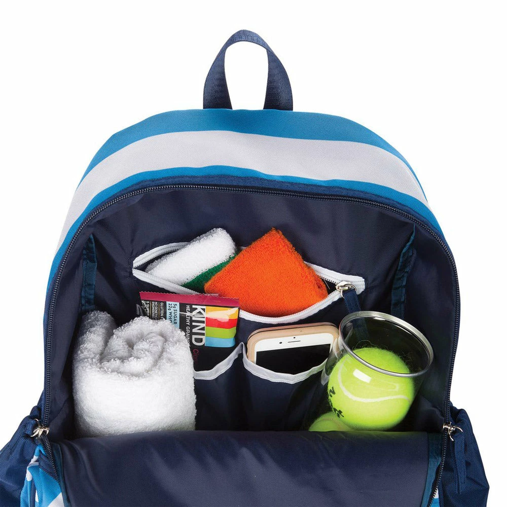 A racquet bag thats means business, just like you! The new Ame and Lulu Game On Tennis Backpack takes over for the tennis bags of old, providing fashionable ladies with a stylish bag to take to and from the courts. This backpack features an exterior zippered pocket that can fit up to two tennis racquets as well as exterior side pockets for a water bottle or cans of tennis balls. Inside, ladies will find slip pockets and zippered pockets for organizing small essentials. Pick your favorite pattern from a collection of trendy designs.