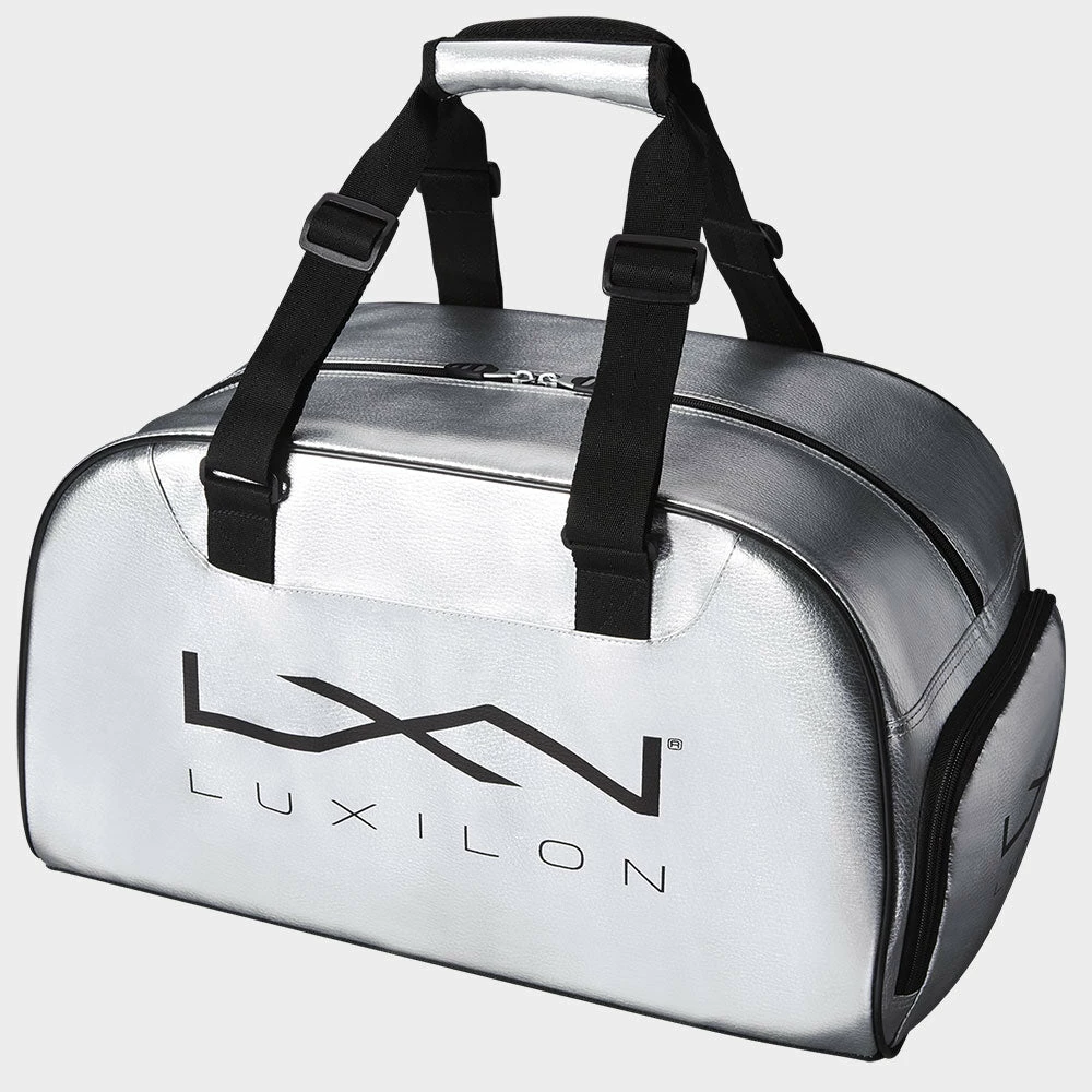 Convenient storage meets sleek style in the Luxilon Duffle Bag! Featuring a main compartment with ample space for your essentials, this duffle bag also includes a side zipper pocket for valuables. The exterior shoe tunnel keeps used and dirty items separate from the rest of your gear. Padded shoulder straps and handles offer convenient carrying, while plastic feet on the bottom add durability. The shiny silver finish makes a stylish statement as you light up the courts!