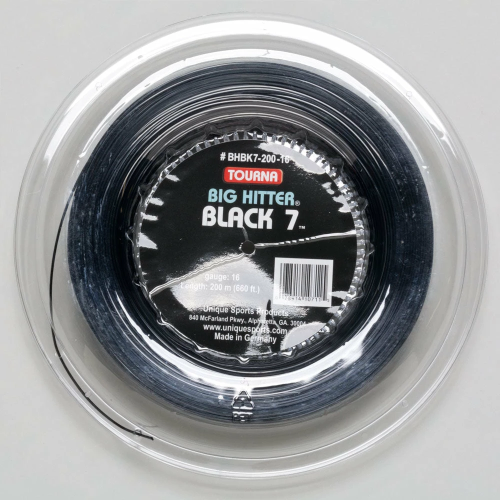 Polyester. Tourna Big Hitter Black 7 16 is a polyester string that offers control and exceptional spin potential because it is shaped with seven sharp edges that bite into the ball. Ideal for strong players, Big Hitter Black 7 features specially blended polyester and polyether materials that are able to hold tension better than standard polyester strings. Tourna Big Hitter Black 7 16 is ideal for chronic string breakers who crave more control and spin potential.