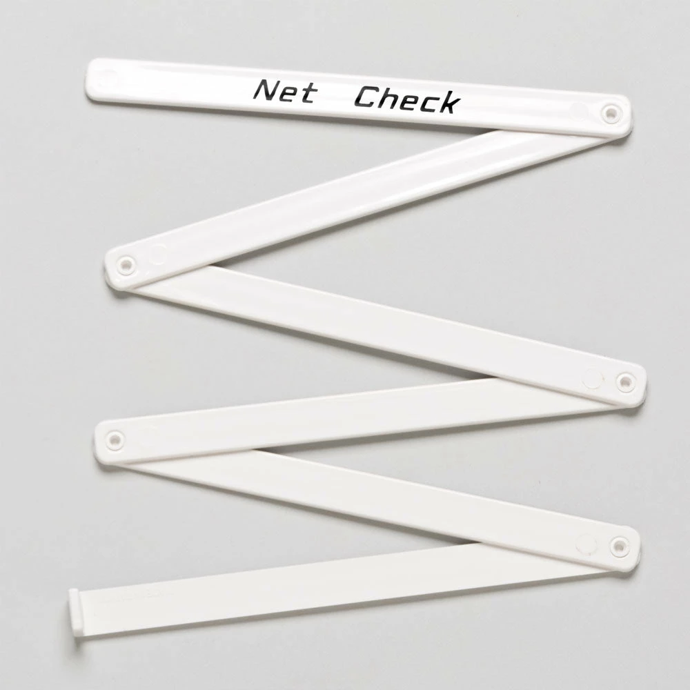 Net Check accurately measures net height. Plastic tool folds for easy bag storage. Very light. Very accurate. Lip at top of tool is designed to rest on net to start the measurement. A great gift item! Note: This net opens to an exact 3′ net height.